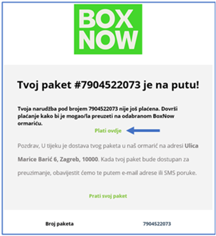 Kada preuzmemo Vaš paket u webshopu, zaprimit ćete poruku u kojoj Vas informiramo kako je paket na putu i kako izvršiti uplatu putem linka (označeno niže).