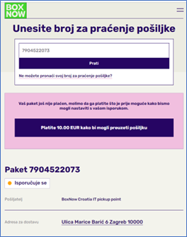 Klikom na link za plaćanje dolazite na našu stranicu za praćenje statusa paketa gdje Vam se nudi opcija plaćanja: ‘’Platite XX.XX EUR kako bi mogli preuzeti pošiljku’’